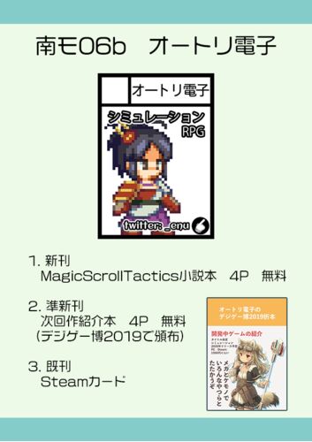 サークルスペース 火南モ06b オートリ電子 頒布物 MagicScrollTactics小説本。4Pの折本です。新刊。無料。 次回作紹介折本。デジゲー博で頒布したやつです。無料 Steamカード というギリギリな感じですがなんとか新刊があります。